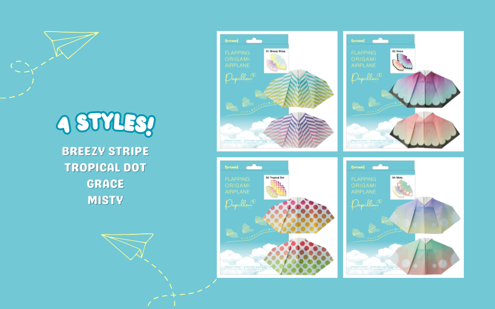 Reminiscent of butterflies. these fluttering paper airplanes come in four colorful designs. 2 Papillon airplanes come pre-folded in an origami style that requires minor adjustments to allow their wings to flap.